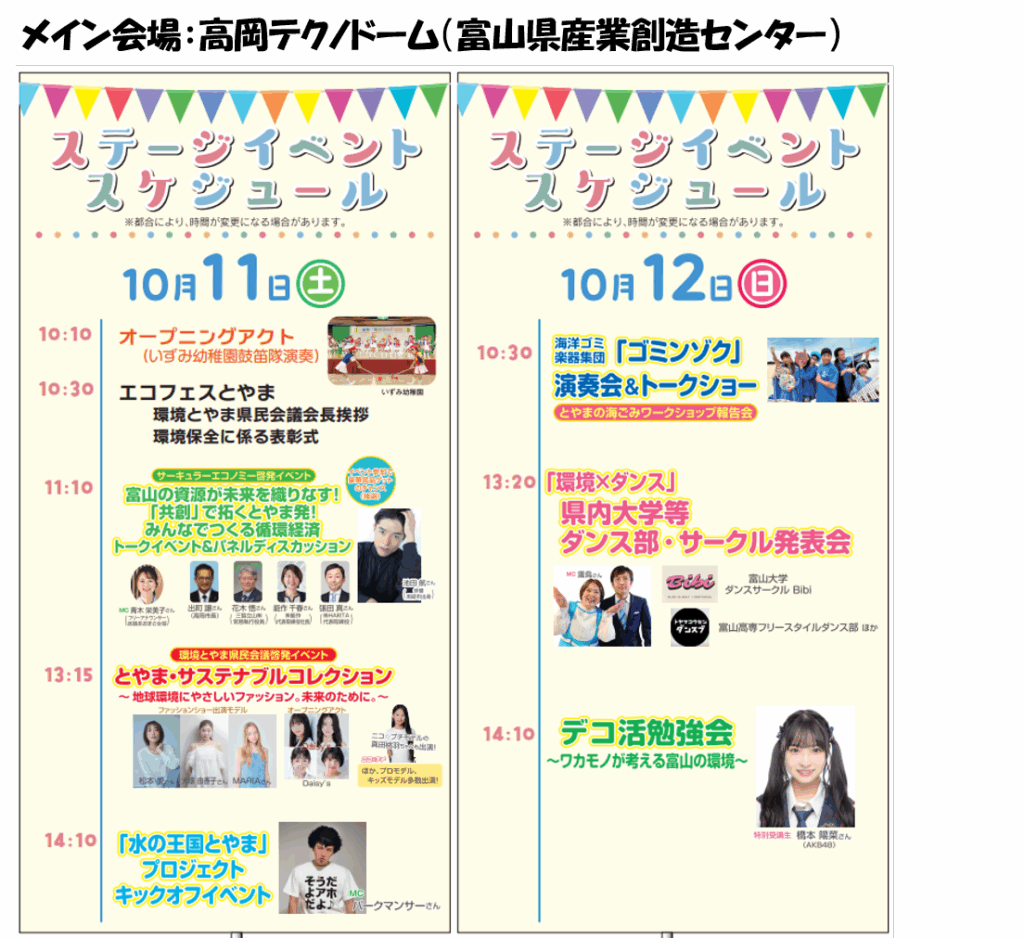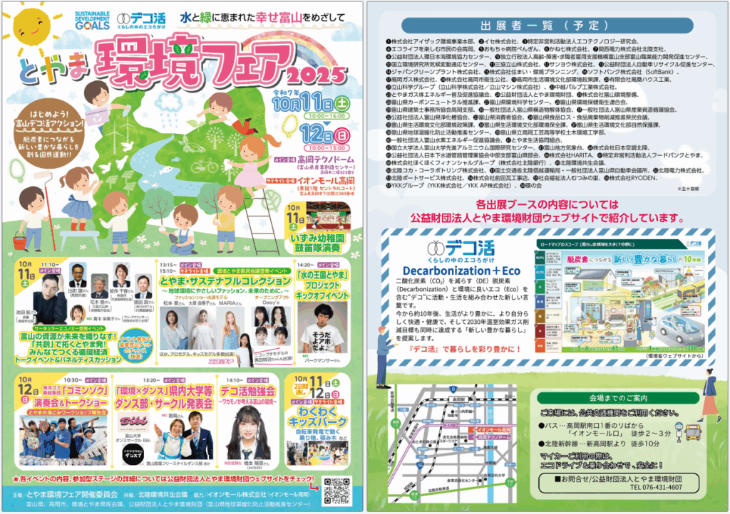 本年は、『水と緑に恵まれた幸せ富山をめざして ~ はじめよう、富山デコ活アクション! ~ 』をテーマとし、企業・団体の環境保全の取組みや製品・サービスを見聞でき、体感・体験を通じて環境配慮を学ぶことができる「出展ブース」や、来場者が楽しく参加できるステージイベントを実施するなど、にぎやかで楽しめるイベントとして開催いたします。(ちらしはこちら)