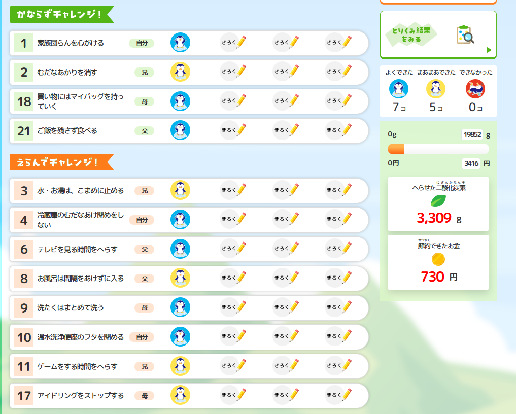 2週間以上取り組むときは、1週間に1回、取り組みをひょうかした後にとりくみノートの画面をさつえいしておくと、1週間ごとのへらせた二酸化炭素の量や節約したお金を計算しやすくなります。週ごとのへらせた二酸化炭素の量や節約したお金を表やグラフにするとチャレンジのがんばりがわかりやすくなります。